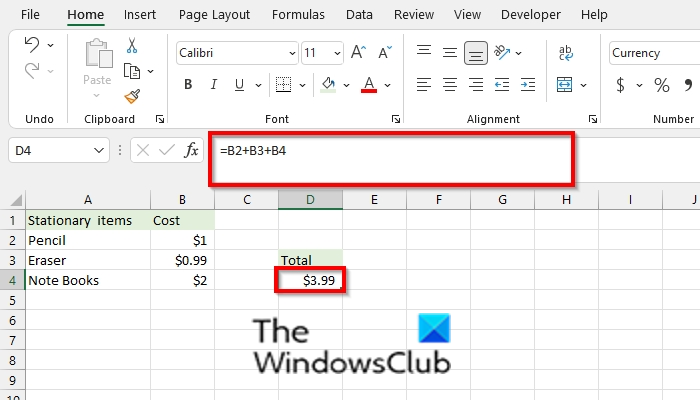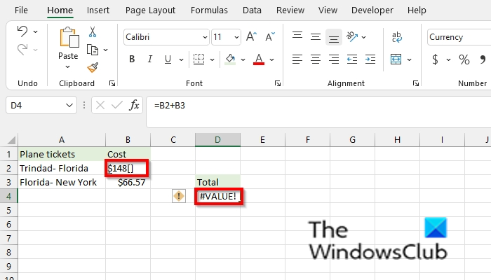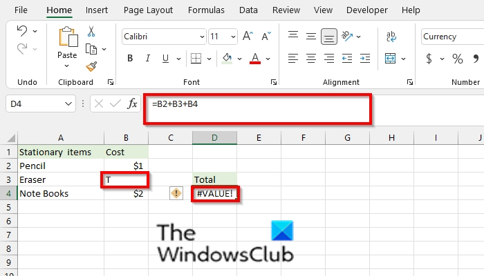 Een van de problemen die de fout kunnen veroorzaken, is wanneer u de verwijzing probeert te typen als=B2+B3+B4met per ongeluk een tekst in het kostengebied.