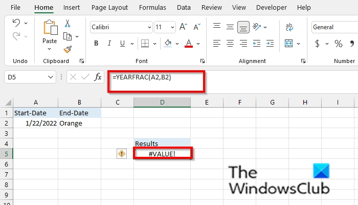 De fout kan optreden wanneer u de verkeerde gegevens invoert die niet overeenkomen met de functiereferentie. Op de foto boven de tekst gaat Oranje bijvoorbeeld niet mee met deJaarFracfunctie. YearFrac is een functie die een decimale waarde retourneert die de fractionele jaren tussen twee datums vertegenwoordigt.