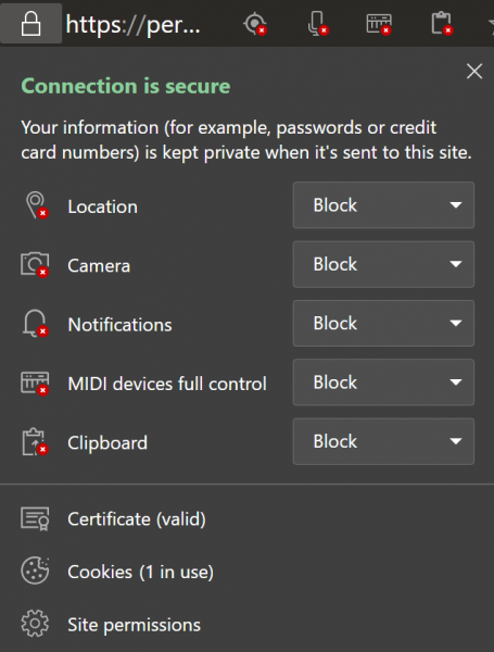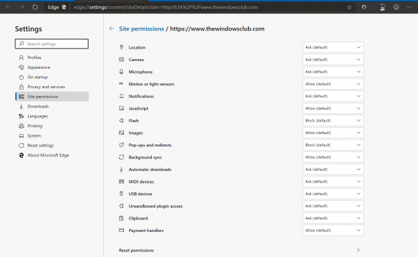 Het op chroom gebaseerdeMicrosoft Edge-browserHiermee kan de gebruiker de machtigingen voor een bepaalde website aanpassen. Dat omvat het gebruik van verschillende API's om de gegevens van de gebruiker te verkrijgen die nodig zijn om de pagina te laten werken. Het omvat ook het gebruik van verschillende plug-ins die op de computer zijn geïnstalleerd of zijn ingebed in de browsercode.