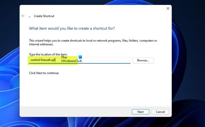 Dat kan ookvoor Windows Firewall en plaats het op uw bureaublad of waar u maar wilt. Wanneer u de snelkoppeling maakt, voert u de tekst incontrol firewall.cplin deTyp de locatie van het itemveld. Nadat u met succes de snelkoppeling op het bureaublad hebt gemaakt, dubbelklikt u op de snelkoppeling om de Windows Defender Firewall-applet te openen.