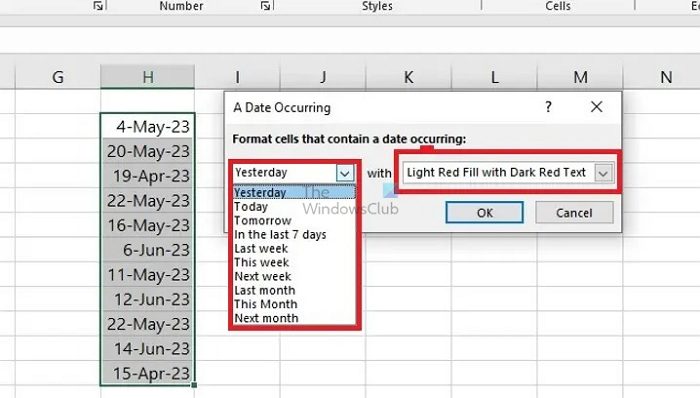 - De voorwaardelijke opmaakopties kunnen worden gekozen uit de vervolgkeuzemenu's in het volgende venster. In de eerste vervolgkeuzelijst kunnen we het dagbereik selecteren, en de opmaakopties kunnen uit de tweede worden gekozen.