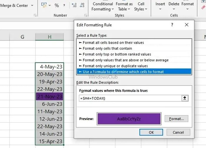De bovenstaande formule controleert het geselecteerde datumbereik voor de huidige datum en zodra de overeenkomst is gevonden, wijzigt u de achtergrondkleur in Paars, zoals geselecteerd in de optie Opmaak. De$naast gebruiktHbetekent dat de kolom constant zou blijven, maar de rijen zouden variabel zijn.