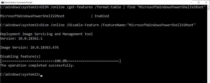 Dism /online /Disable-Feature /FeatureName:"MicrosoftWindowsPowerShellV2Root"
