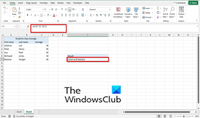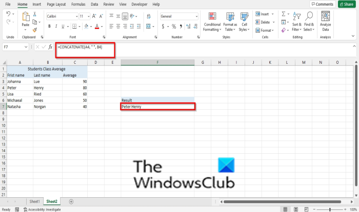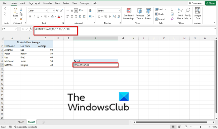 Je kunt ook een komma tussen je woorden toevoegen met behulp van de formule=SAMENVOEGEN(A3, ” “, B3, “,”, 90). Op de foto hierboven ziet u dat we de achternaam en de voornaam hebben samengevoegd en een komma hebben toegevoegd om het gemiddelde te scheiden.