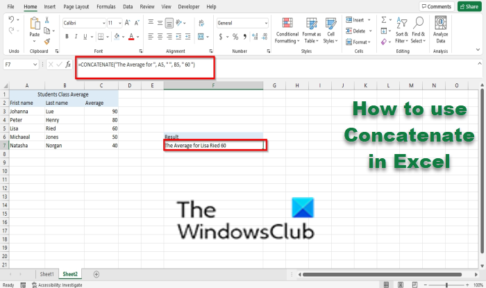 U kunt de functie Samenvoegen gebruiken om zinnen in uw tabel of spreadsheet te maken. Op de foto hierboven wilden we een zin creëren die Lisa Ried gemiddeld 60 kreeg. De formule zou zijn=CONCATENATE(“Het gemiddelde voor “, A5, ” “, B5, ” 60 “). U zult merken dat de tekst in A5 is samengevoegd met B5.