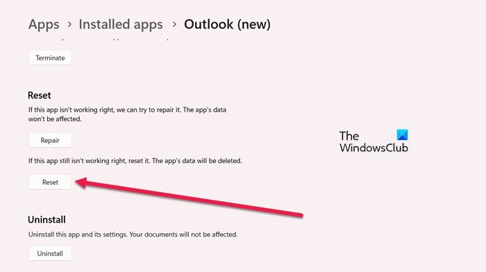 - Navigeer naar het gedeelte Opnieuw instellen en klik op de optie Reparatie. Als het repareren niet werkt, klikt u deze keer op de optie Opnieuw instellen om Outlook terug te zetten naar de standaardinstellingen. Deze procedure kan echter enkele gegevens verwijderen.