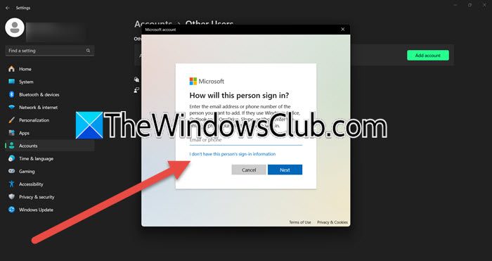 - Klik op Iemand toevoegen onder het gedeelte Andere gebruikers en klik in het Windows Microsoft-venster op'Ik heb de inloggegevens van deze persoon niet'.