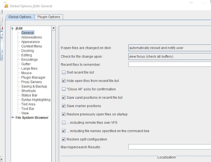Ten slotte is het tabblad Hulpprogramma's de thuisbasis van Global Options, waar mensen verschillende wijzigingen kunnen aanbrengen in de manier waarop jEdit werkt. We raden u aan de tijd te nemen om de Global Options zorgvuldig te bekijken, omdat de informatie daar uitgebreid is en voor verwarring kan zorgen.
