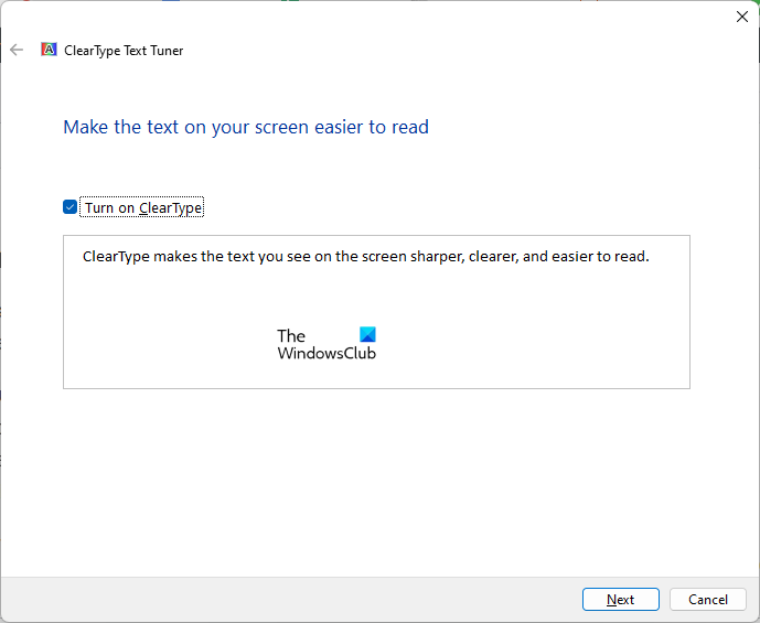 - Als deSchakel ClearType inselectievakje is uitgeschakeld, selecteert u het en klikt uVolgende.