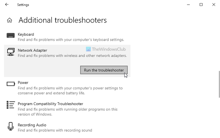 Hier vindt u deNetwerkadapter. Selecteer deze probleemoplosser en klik op deVoer de probleemoplosser uitknop.