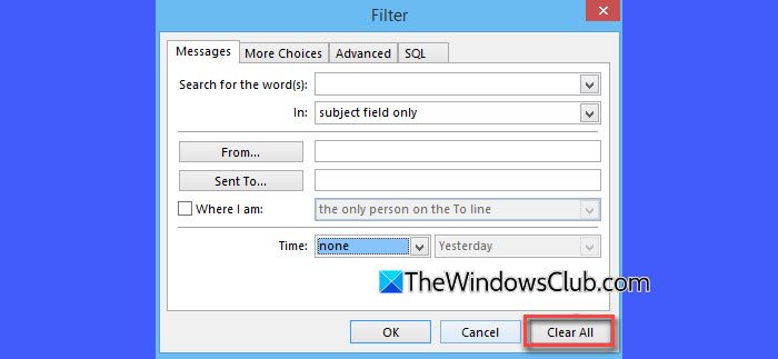 Filters kunnen ervoor zorgen dat een PST-bestand leeg lijkt als ze alle e-mails verbergen op basis van specifieke criteria. Als het ongelezen filter bijvoorbeeld wordt toegepast, worden alleen ongelezen e-mails weergegeven; en als alle e-mails zijn gelezen, ziet de map er leeg uit. Controleer en schakel filters uit en kijk of het probleem hiermee is opgelost.