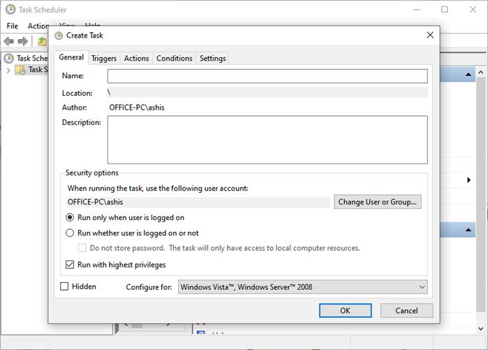 - Maak een nieuwe taak en zorg ervoor dat u twee opties selecteert:Alleen uitvoeren als de gebruiker is aangemelden vink het vakje aan dat zegtRen met de hoogste privileges.