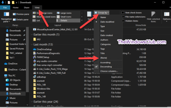 Klik op deWeergavetabblad en klik vervolgens op deGroepeer opvervolgkeuzemenu en selecteerGeenuit de lijst.