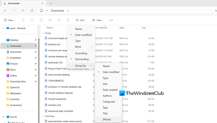 U mag de bestanden groeperen op Datum, Bestandsgrootte, Type, Grootte of Geen in deWij hebben echter gemerkt dat deMap Downloadsis gegroepeerd opDatum gewijzigden ze kunnen het niet herstellen. In dit bericht zullen we zien hoeverwijder Groeperen en kortsluiten op datum in de map Downloads.
