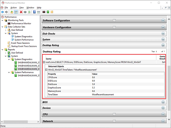 Na 60 seconden krijgt u eenPrestatierapport.Samen met enkele details zoalsCPU, Netwerk,EnSchijfgebruik, zal het rapport ook bepaalde details bevatten met betrekking tot de apparaatconfiguratie.