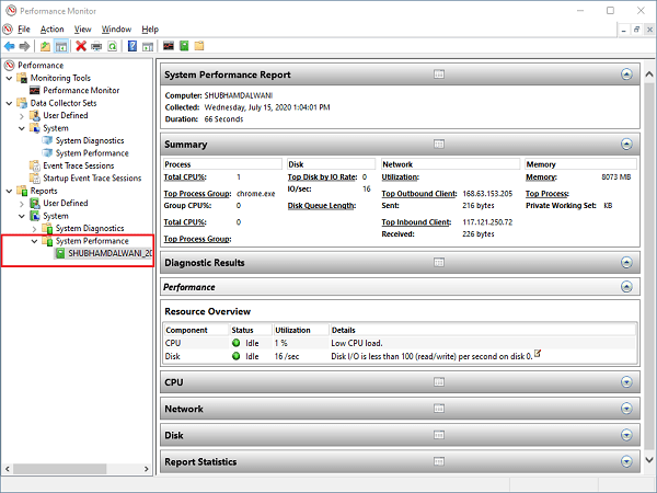 Het zal omvatten deSysteemprestatierapport, samenvatting, diagnostische resultaten, rapportstatistieken,en informatie overCPU, netwerk,EnSchijfgebruik.