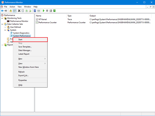 Klik met de rechtermuisknop op deSysteemprestatiesen klik op Starten. Nu zal het proces van gegevensverzameling opnieuw worden uitgevoerd.