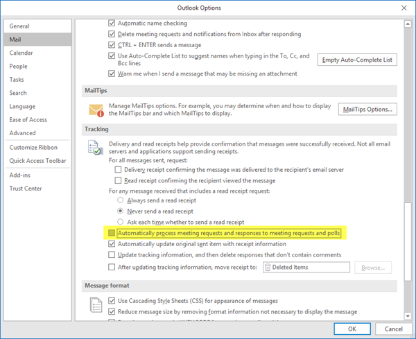 Open Microsoft Outlook. Klik vervolgens op Bestand > Opties > E-mail en schakel hier Vergaderverzoeken en antwoorden op vergaderverzoeken en polls automatisch verwerken uit.