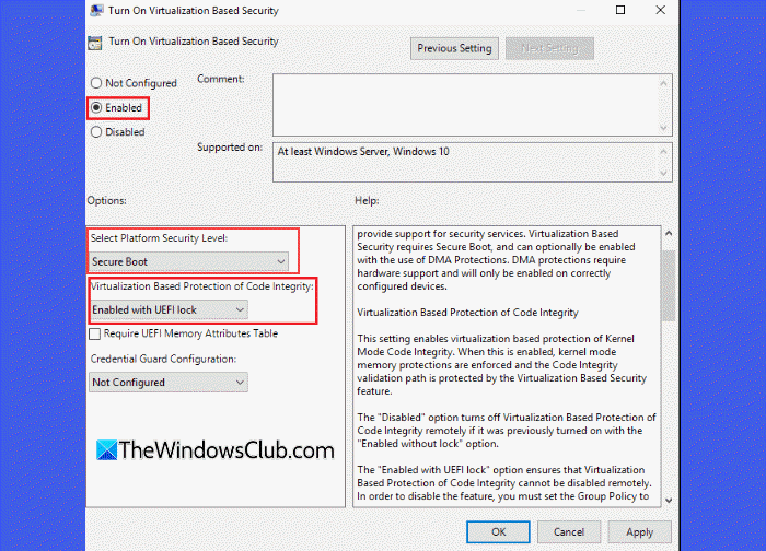 Dubbelklik opSchakel op virtualisatie gebaseerde beveiliging in. In het geopende venster selecteert u het volgende: