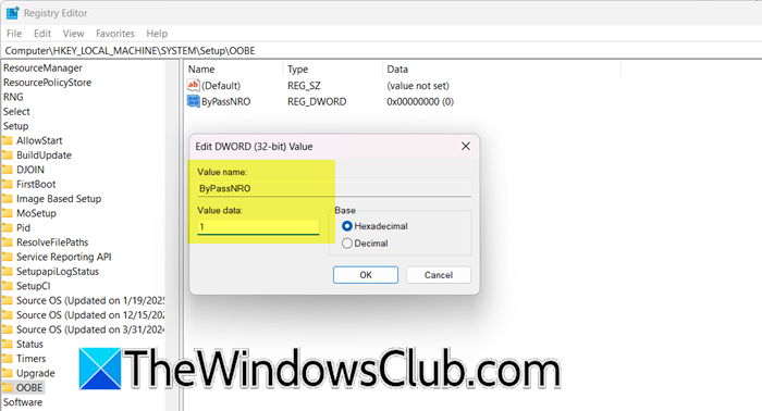- Klik met de rechtermuisknop in de OOBE-sleutel op het rechterpaneel en selecteer vervolgensNieuw > DWORD (32-bit)-waardeen hernoem het naarByPassNRO.