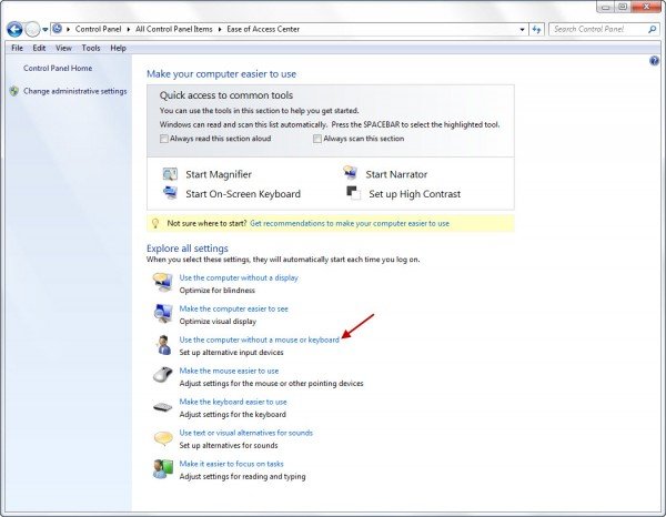 Klik hier op Gebruik de computer zonder toetsenbord of muis. Het volledige pad is: