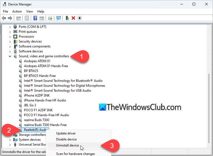 Druk opWinnen + Xen selecteerApparaatbeheer. Uitbreiden 'Geluids-, video- en gamecontrollers' en lokaliserenRealtek-audio(of Realtek High Definition Audio). Klik er met de rechtermuisknop op en selecteerApparaat verwijderen.