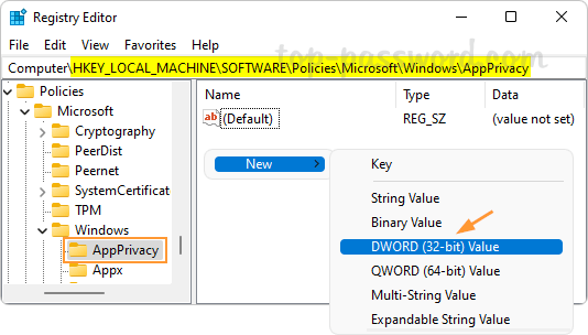 HKEY_LOCAL_MACHINE\SOFTWARE\Policies\Microsoft\Windows\AppPrivacy. Høyreklikk på det tomme området i høyre rute og velgNy->DWORD (32-biters) verdi.