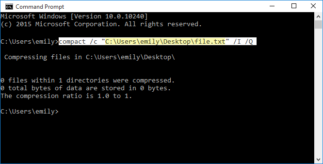 kompakt /c “C:UsersemilyDesktopfile.txt” /I /Q