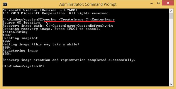 - Fra ledeteksten, kjør recimg.exe-verktøyet for å lage en egendefinert bildefil i den angitte mappen.