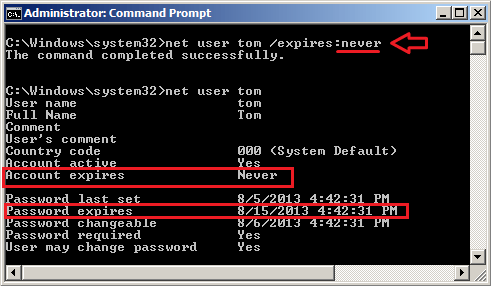 WMIC USERACCOUNT WHERE Name=’Tom’ SET PasswordExpires=FALSE