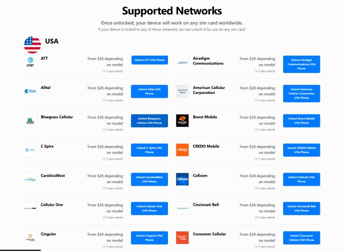DirectUnlocks støtter en lang liste over amerikanske og globale operatører. Det inkluderer store som: