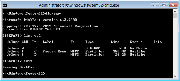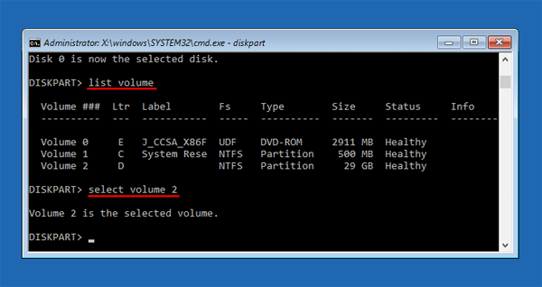 - Skriv nålistevolumfor å få en liste over alle partisjonene på den valgte disken. Finn partisjonen der Windows er installert og skriv innvelg volum n, hvor n er nummeret på Windows-partisjonen din.