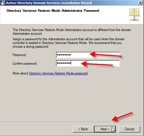 19.Velg nå et passord forKatalogtjenester gjenopprettingsmodussom er forskjellig fra domenepassordet. Skriv inn passordet ditt og bekreft det før du trykkerNeste.