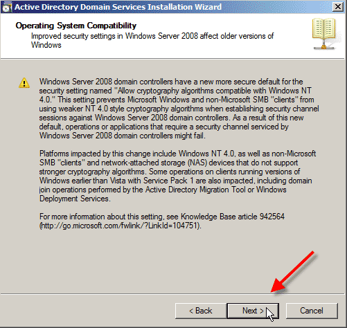 11.Den neste skjermen advarer om noe operativsystemkompatibilitet med noen eldre klienter. KlikkNeste.