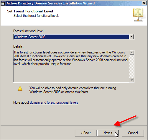 Siden dette er en ny installasjon og en ny skog uten flere tidligere versjonsdomener å bekymre meg for, kommer jeg til å velge Windows Server 2008. Hvis du hadde andre domenekontrollere i tidligere versjoner eller hadde behov for å ha Windows 2000 eller 2003 domenekontrollere (på grunn av Exchange for eksempel), bør du velge riktig funksjonsnivå.