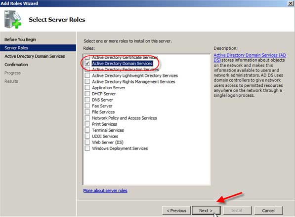4.IVelg Serverrollervindu vi skal sette en sjekk ved siden avActive Directory-domenetjenesterog klikkNeste.