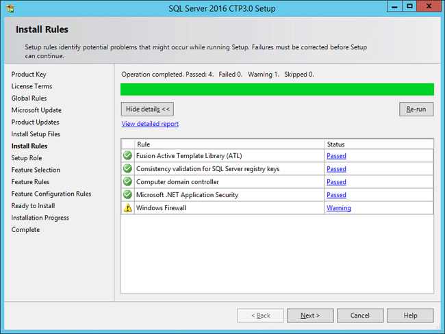 - Kjør kontrollene for oppsettregler. Jeg har en advarsel om å fortelle meg at brannmuren er på og bare ignorere den hvis du ikke har konfigurert Windows-brannmuren til å blokkere SQL Server-tilgang.