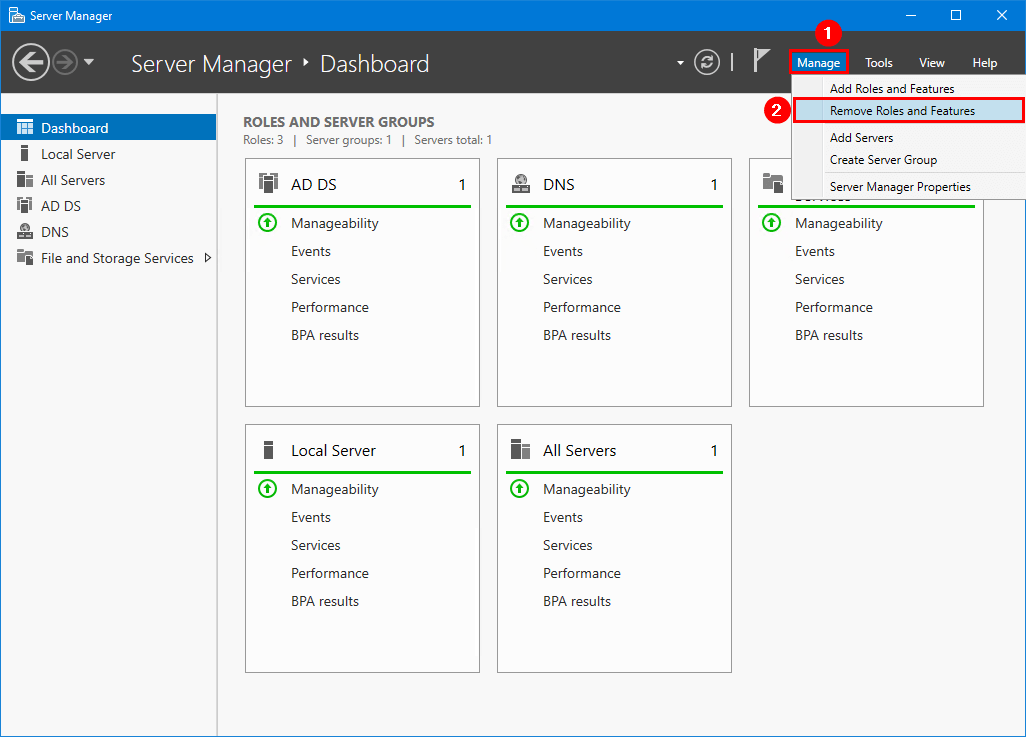- Klikk påAdministrerog velgFjern roller og funksjoner
