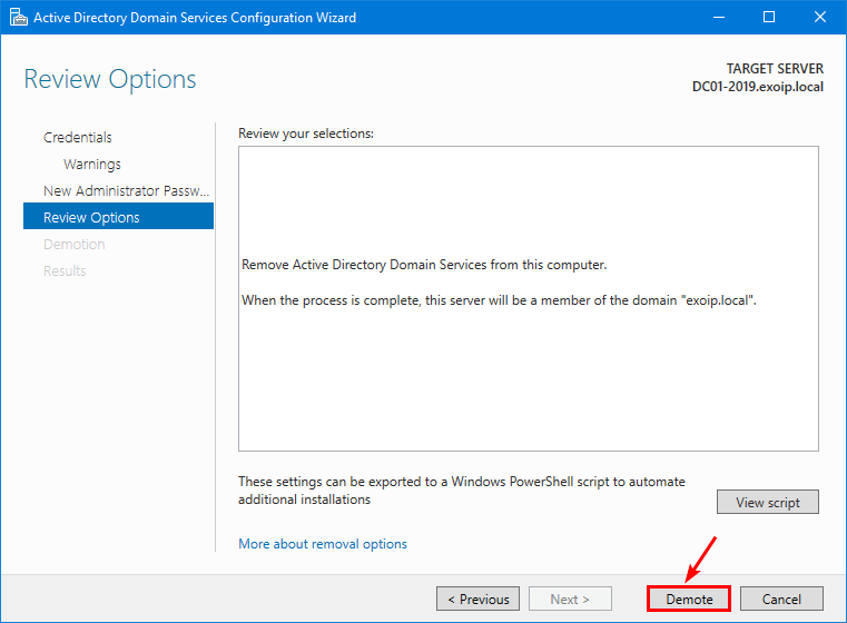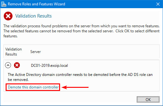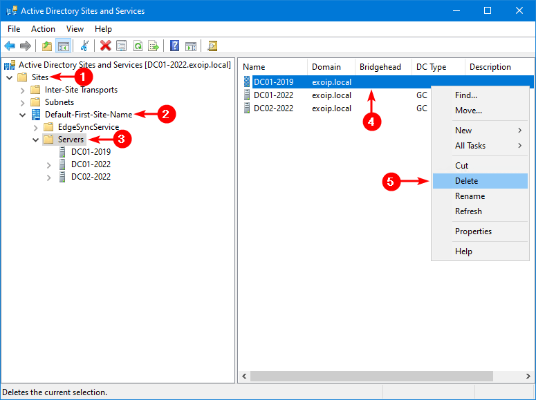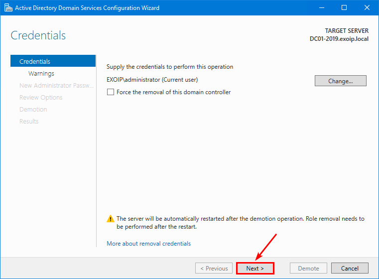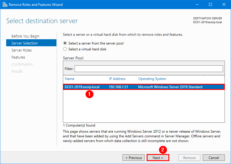 I vårt eksempel vil vi fjerne domenekontrollerenDC01-2019.