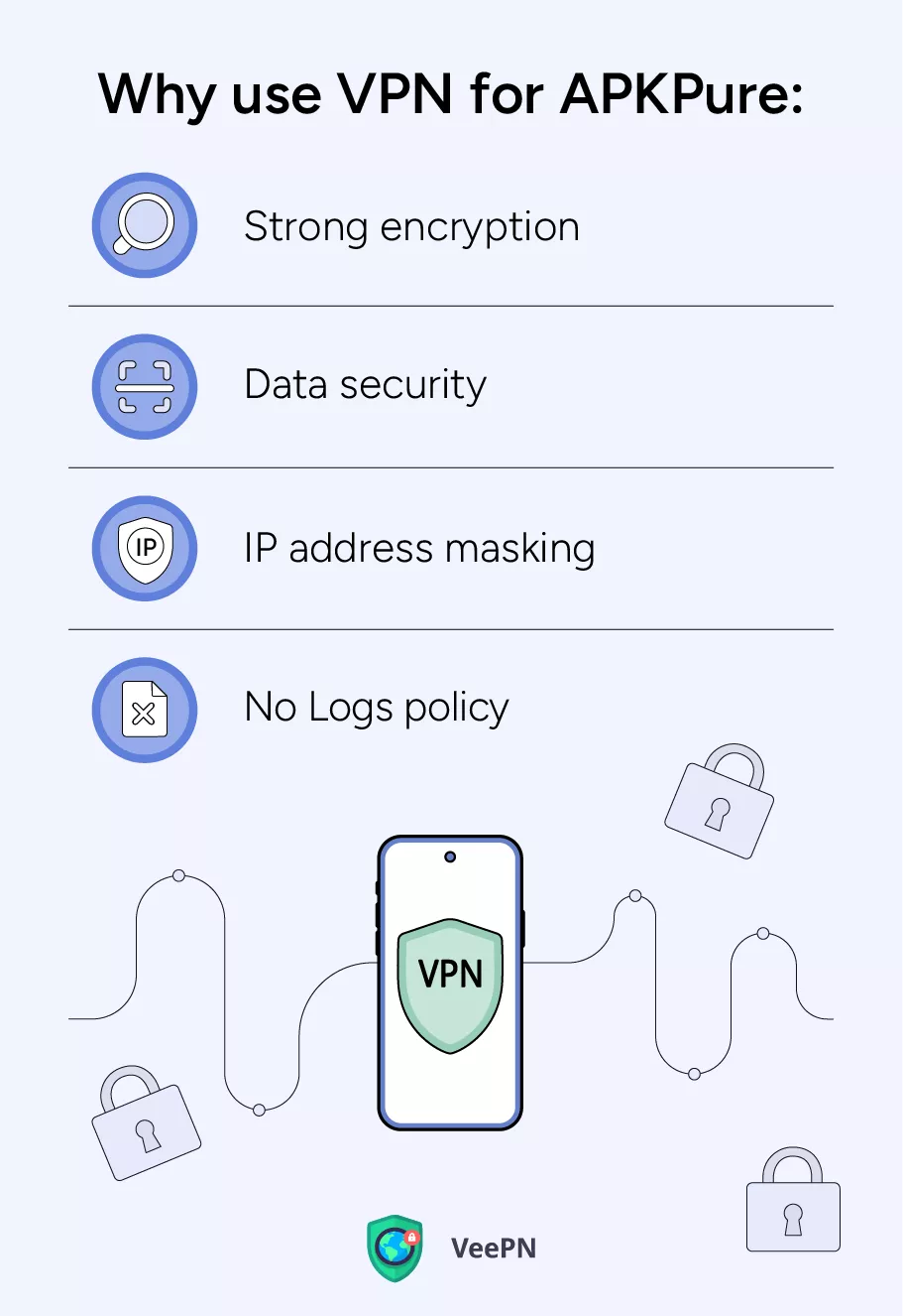 For å gjøre historien kort,APKPure er ikke helt trygtsiden du ikke kan være sikker på om applikasjoner du installerer ikke inneholder skadelig programvare/spyware. For å beskytte deg selv mens du laster ned apper fra APKPure, bruk VeePN – en robust VPN-app som vil kryptere all Internett-trafikken din og blokkere all skadelig programvare.