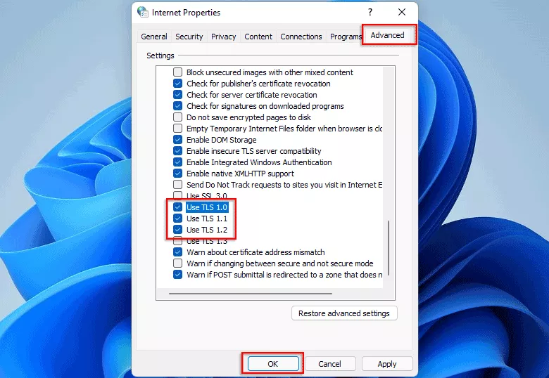 Trinn 2:Bytt tilAvansertfanen og sjekkBruk TLS 1.0,Bruk TLS 1.1,