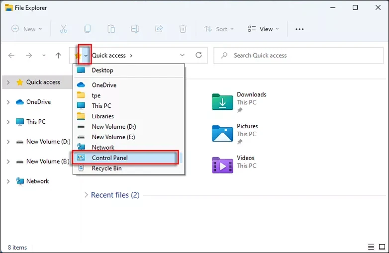 Trinn 1Åpne Filutforsker, klikk deretter på rullegardinknappen på adresselinjen og velg