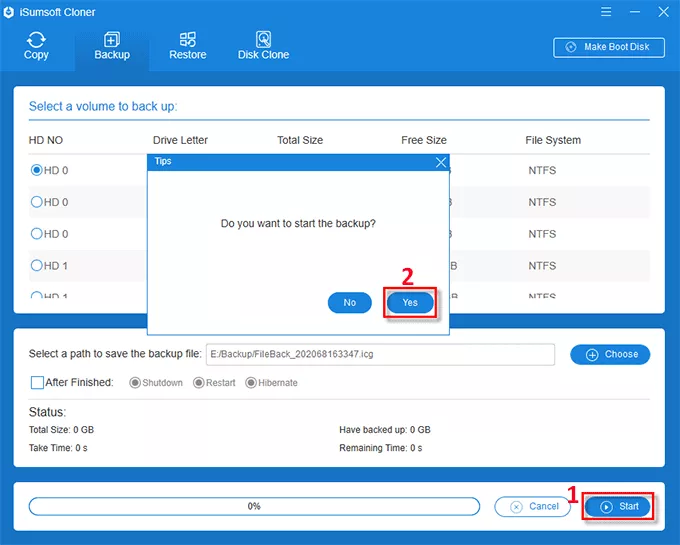 Trinn 4KlikkStartfor å begynne å sikkerhetskopiere og velgeJafor å bekrefte din