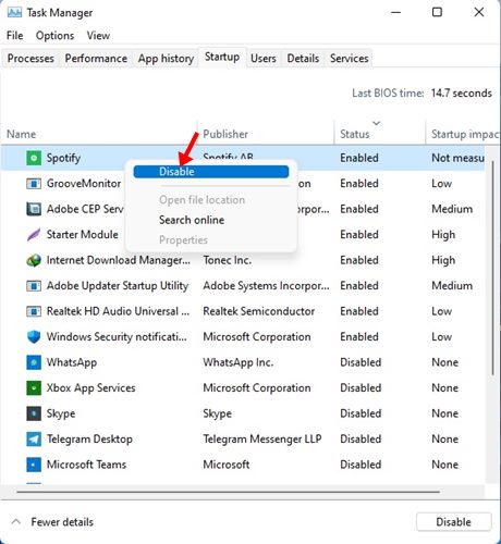 3. Start Oppgavebehandling og bytt tilOppstartfanen. Høyreklikk på appene du ikke vil kjøre ved oppstart og velgDeaktiver.