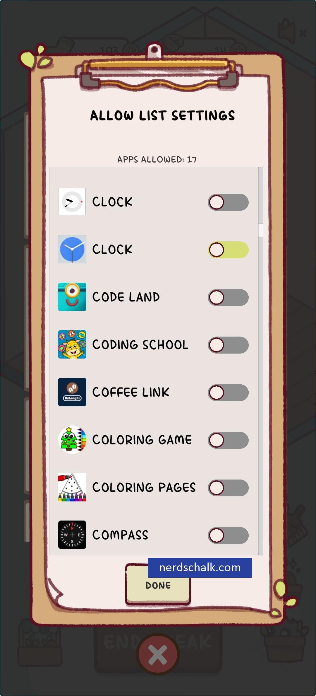 Når Deep Focus er aktiv, kan durediger tillatelseslistenslik at bare spesifikke apper forblir brukbare. Alt annet forblir blokkert til økten din avsluttes.
