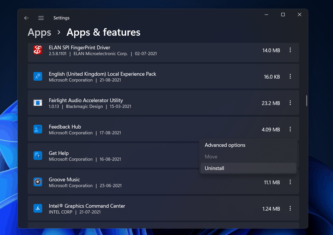 - Klikk påtre ellipserpåFeedback Hub,og klikk deretter påavinstallerefor å avinstallere applikasjonen.