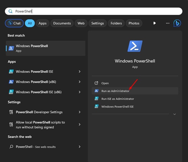 1. Trykk på Windows-tasten + S-knappen på tastaturet. På Windows-søk, skriv PowerShell, høyreklikk påPowerShellapp og velgKjør som administrator.