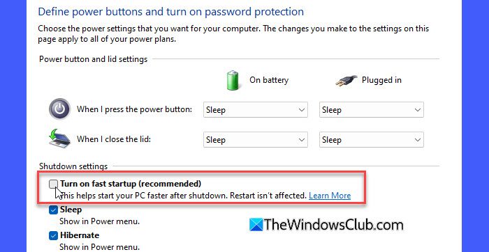 - Fjern merket for 'Slå på rask oppstart (anbefalt)'.