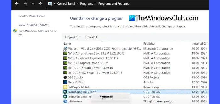 For å fikse PredatorSense hvis den ikke fungerer på din Windows 11/10 PC, prøv å avinstallere og installere appen på nytt. Hvis det er motstridende programvare som AcerSense, bør du vurdere å fjerne dem også. Hvis PredatorSense åpner, men ikke viser systemstatistikk (CPU/GPU-bruk, temperaturer, viftehastigheter, etc.), gjenoppbyggingtellere kan hjelpe.