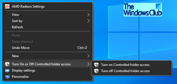 Kontekstmenyen "Slå på eller av kontrollert mappetilgang" vil være tilgjengelig når du høyreklikker på skrivebordet. Denne kontekstmenyen gjør det enkelt for deg å slå på eller av kontrollert mappetilgang på forespørsel etter behov uten å måtte gjøre det gjennom Windows Security.